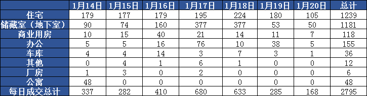 每日住宅网签数量比较平稳,从14-19日每日网签数量在200套左右,20日网签数量急剧下跌,仅网签105套。