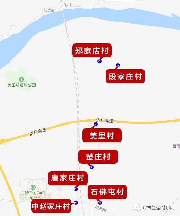 东至段家庄村、郑家店村、美里村、石佛屯村、唐家庄村、中赵家庄村,西至郑家店村、美里村、石佛屯村、楚庄村、唐家庄村、中赵家庄村,南至济齐路与齐鲁大道交叉口,北至黄河。征收项目地块规划红线范围内涉及单位4家,房屋建筑面积约6500平方米,土地总面积约3.6万平方米。